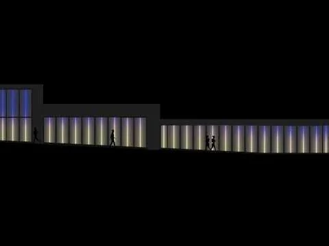 Light Pillars, rare natural phenomena in which vertical beams of light appear to extend from light sources caused by the reflection of light from suspended ice crystals in the atmosphere. Observers traverse the length of the artwork as part of their daily journey – the space itself is a conduit, not a destination. The effect is subtle, natural yet unnatural, the pace is slow but purposeful. The palette is one of natural light, both warmth and coolness, ever-shifting through moments of vibrancy. The artwork is durational, following a circadian rhythm of night to sunrise, day to sunset, dusk to night.